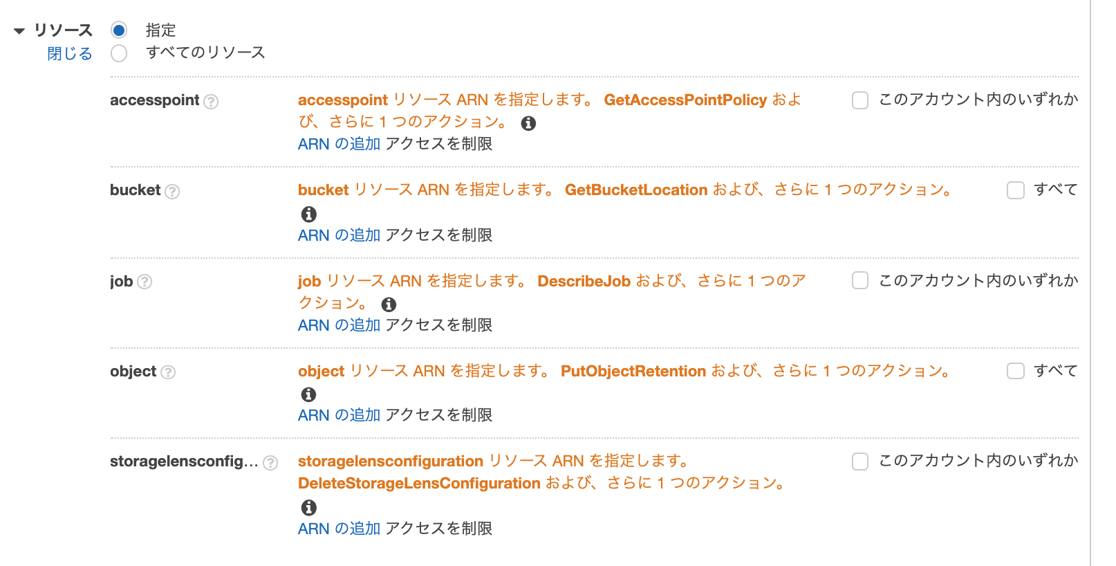 できれば対象バケット以外へのバケットへの操作はさせたくないので、今回ファイルをアップロードしたいバケット名を指定して、制限をかける